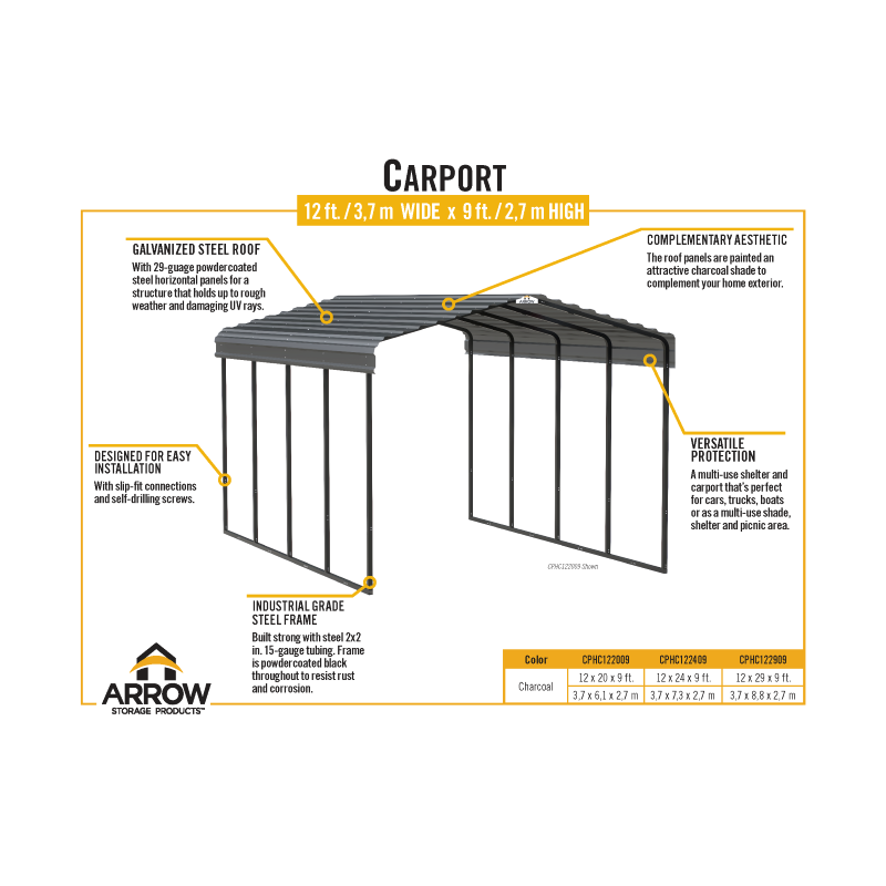 Arrow 12x24x9 Galvanized Steel Carport Kit – Charcoal (CPHC122409)