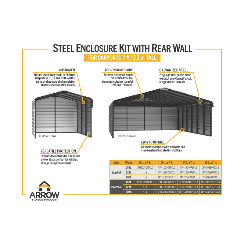 Ideal for those who protect their vehicles or outdoor tools, this solution provides maximum restriction of wind, snow, and rain thanks to its three-sided enclosure. The Arrow Carport with Enclosure is a versatile solution all in steel made for permanent and temporary shelter from sun and rain. Made to suit any area that is subject to harsh weather conditions, every Arrow Carport is assembled to endure extreme weather. It is conveniently rated for snow loads. Each individual Carport measures at an accommodating 10 ft. in width, 15 ft. in length, and 7 ft. in height which provide useful functionality whether it be as a motor vehicle shelter or shaded area for social gatherings. Use it to shield any car from harsh day-to-day weather or to provide shade for patios and outdoor socialization.