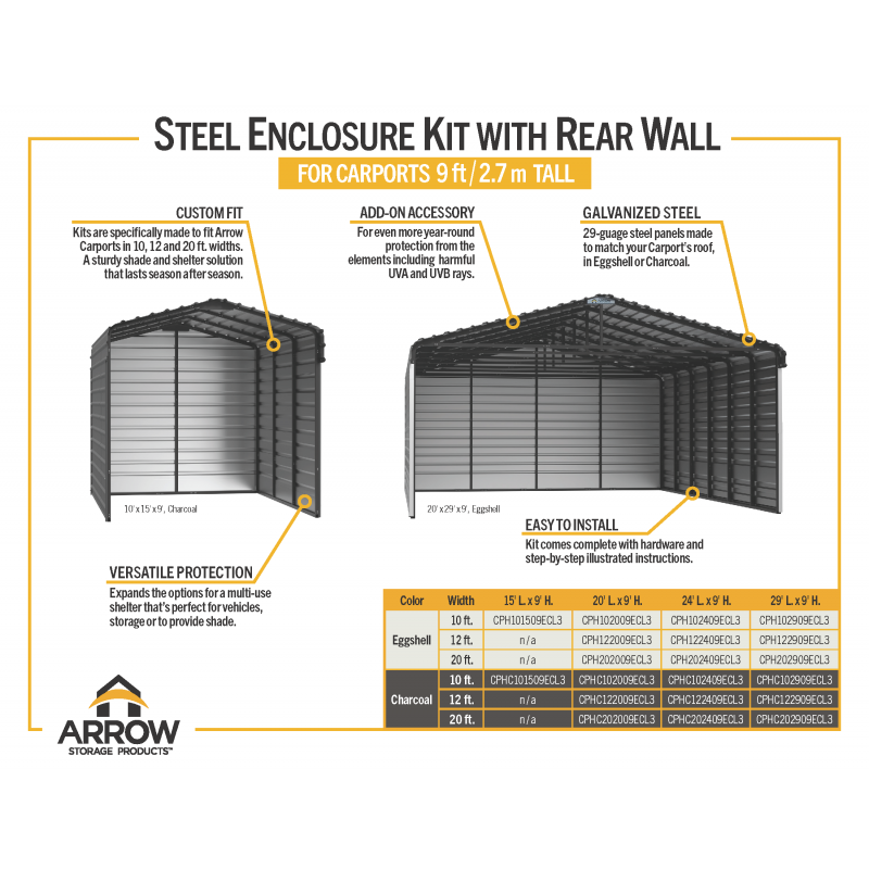 Looking for a way to keep your vehicles, outdoor gear, and other prized possessions safe from the elements? This spacious carport is just what you need! Measuring 12 feet wide, 20 feet long, and 9 feet high, it offers plenty of room for cars, trucks, motorcycles, and more—making it a must-have for any property. The all-steel Arrow Carport with Enclosure is not only convenient and versatile but also a practical solution for all-weather shade and shelter, perfect for any spot where you need some protection. Each Arrow Carport is built to handle heavy snow loads and tough weather, so you can rest easy knowing your belongings are safe. Plus, with three wall kits included, you can add an extra layer of security and privacy, transforming it into a fully enclosed space. This makes it perfect for a workshop, storage area, or even a fun recreational spot. Setting it up is a breeze, thanks to clear instructions and all the hardware you need included, so you can get your carport up and running in no time. Whether you want to shield your daily driver from the weather or keep your patio or party area cool and shaded, this carport has got you covered!