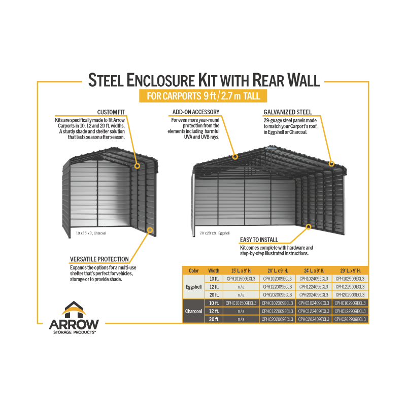 Looking for a way to keep your vehicles, outdoor gear, and other prized possessions safe from the elements? This spacious carport is just what you need! Measuring 20 feet wide, 20 feet long, and 9 feet high, it offers plenty of room for cars, trucks, motorcycles, and more—making it a must-have for any property. The all-steel Arrow Carport with Enclosure is not only convenient and versatile but also a practical solution for all-weather shade and shelter, perfect for any spot where you need some protection. Each Arrow Carport is built to handle heavy snow loads and tough weather, so you can rest easy knowing your belongings are safe. Plus, with three wall kits included, you can add an extra layer of security and privacy, transforming it into a fully enclosed space. This makes it perfect for a workshop, storage area, or even a fun recreational spot. Setting it up is a breeze, thanks to clear instructions and all the hardware you need included, so you can get your carport up and running in no time. Whether you want to shield your daily driver from the weather or keep your patio or party area cool and shaded, this carport has got you covered!