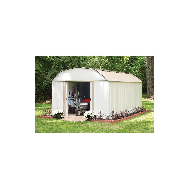 The barn style Lexington 10’x14′ steel storage building is an exceptional storage value. Give your tools a spacious home with a tremendous 852 cubic ft. of space. The gambrel style roof design means a peak height of over 7 ft. for extra head room and work area. Large pad lockable sliding doors open to allow easy storage of most riding mowers and other large equipment. Parts are pre-cut and pre-drilled for a faster assembly. Durable galvanized steel parts will mean a long lasting home  and organized space for your lawn tools, garden equipment, patio furniture , sporting gear and  more. The Lexington is backed by a 12 year limited warranty.