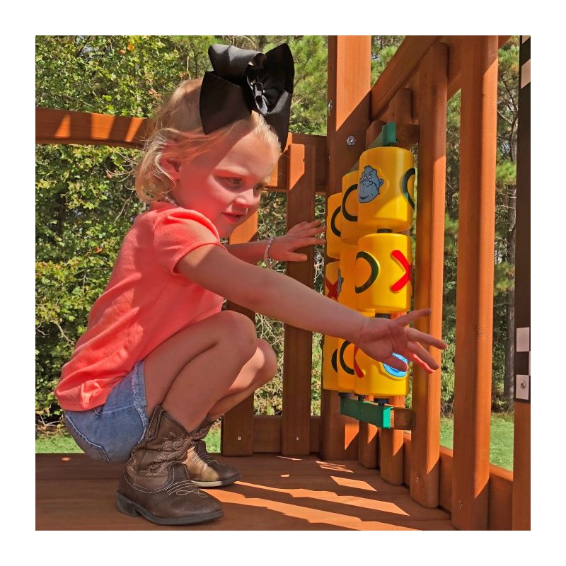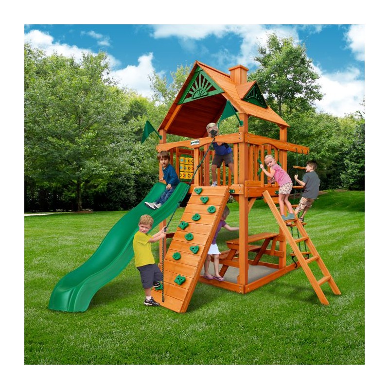 Celebrate the day with adventures and play on the Chateau Tower Swing Set from Gorilla Playsets! We’ve removed the swing beam to fit all of the fun accessories kids love in a set that will fit almost any backyard! The Wiki Wave Slide™ and the Rock Wall with Climbing Rope are sure to keep them busy! The play deck is covered with a Standard Wood Roof. The entire playset is finished in a beautiful amber stain and the main posts and beams are available in maintenance-free Timber Shield™ OR Natural Cedar.