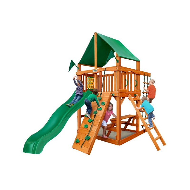 Panel and Rock Wall with Climbing Rope, which are sure to be a hit in any backyard! This premium cedar wood playset is pre-cut, pre-sanded, pre-stained and ready to assemble in your backyard. The play deck is protected with green vinyl canopy. The entire playset is finished in a beautiful amber stain. Gorilla Playsets’ cedar naturally resists rot, decay, and insect damage.