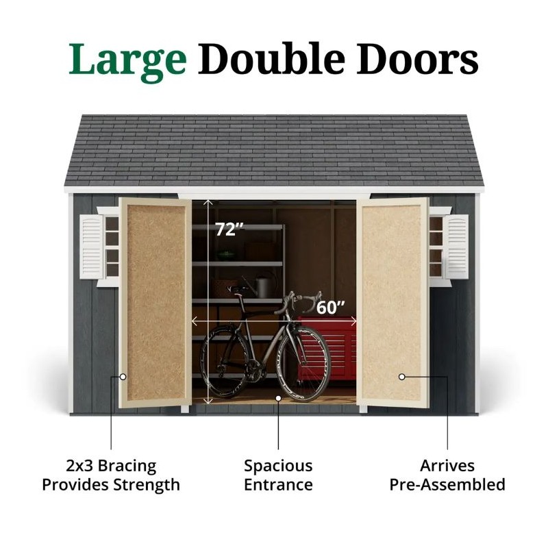 - Pre-assembled double doors with metal door latch and 2×3 bracing to prevent sagging